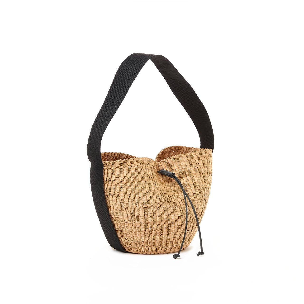 ミニマルなブラックのワンハンドルに、レザーのドローストリングをあしらい、口元はすっきりと閉じられる仕様となっている。