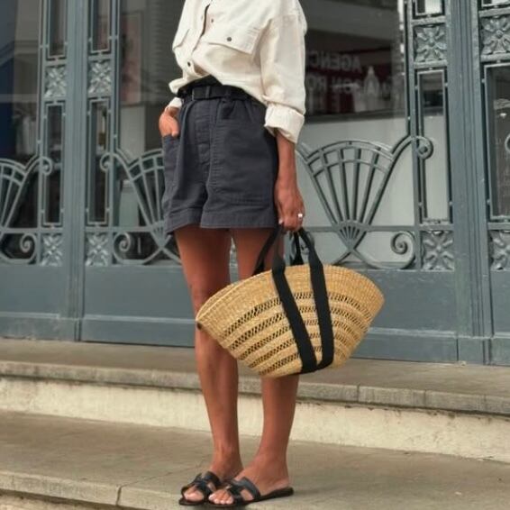 丁寧に編まれたエレファントグラスの美しいフォルムは、しなやかで丈夫。ナチュラルな素材とブラックのコントラストがシックな印象のバッグ。